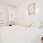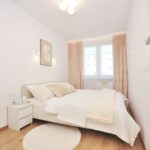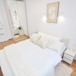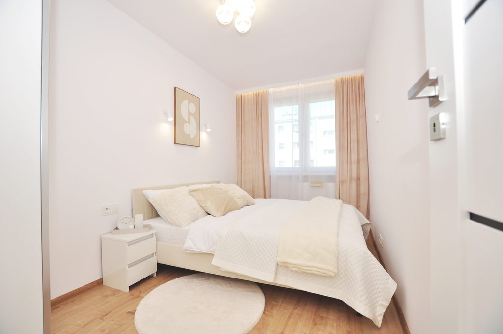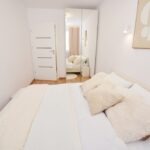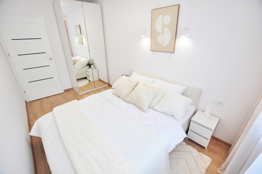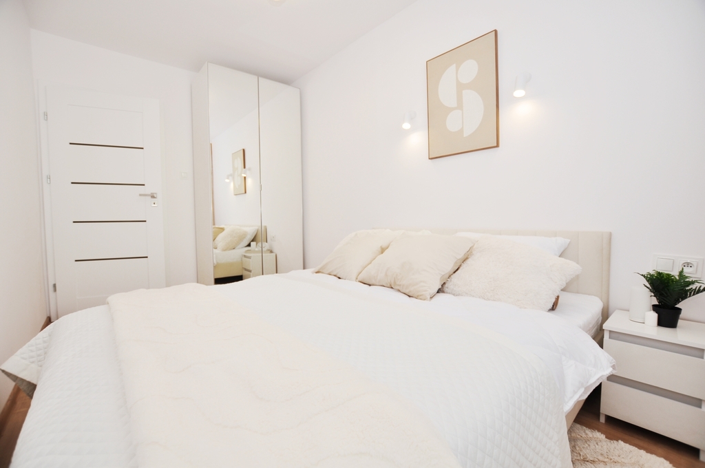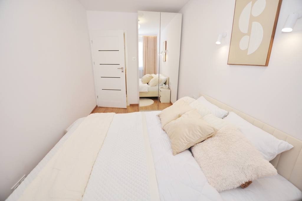 - Sypialnia – przytulna, z dużym łóżkiem małżeńskim, pojemną szafą z lustrami, nowoczesnym oświetleniem i dodatkami tekstylnymi