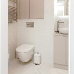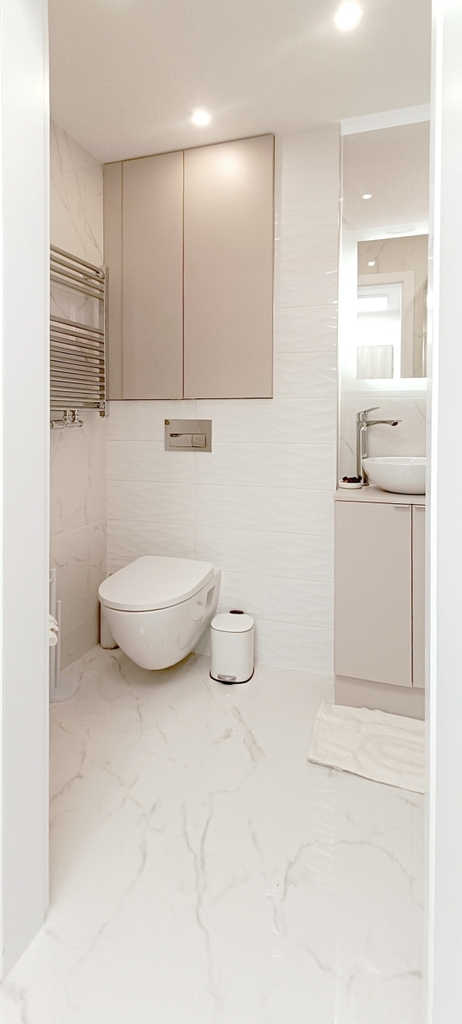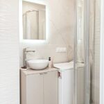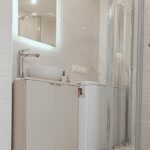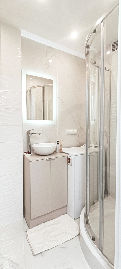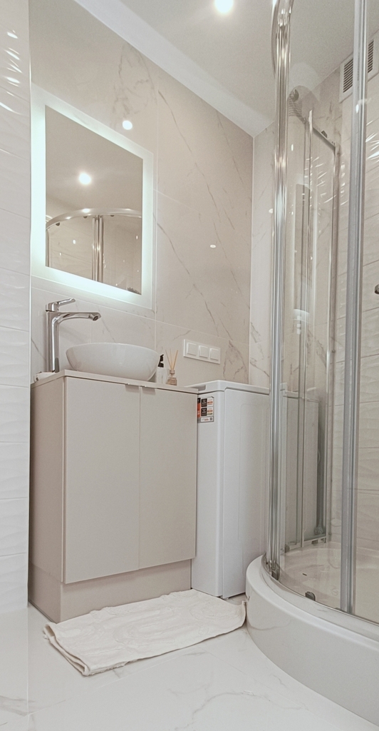 - Łazienka – wykończona w eleganckim stylu, z dużym lustrem LED, kabiną prysznicową, podwieszanym WC, szafkami w zabudowie, pralką i efektowną umywalką nablatową