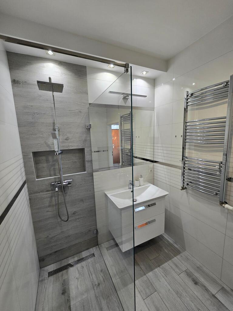 Stylowa, z prysznicem walk-in, dużym lustrem, szafką podumywalkową i halogenowym oświetleniem.