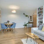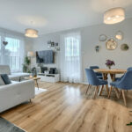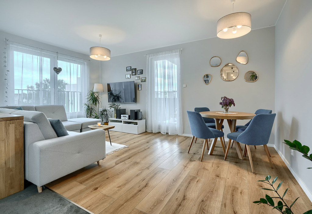 - Przestronny salon z aneksem kuchennym i wyjściem na loggię (28 m² + 8,5 m²)