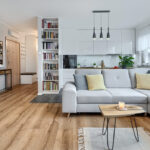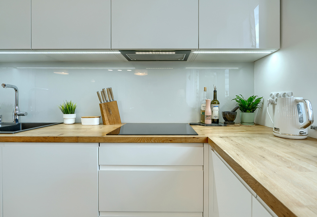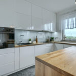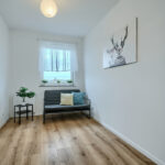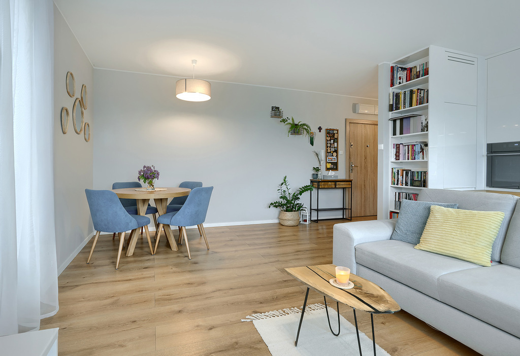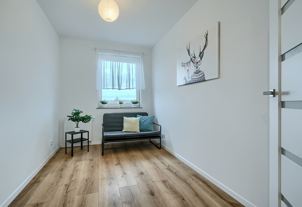 - Wysoki standard wykończenia: panele podłogowe o podwyższonej trwałości, granitowe parapety, meble kuchenne na wymiar z wyspą (sprzęt AGD: piekarnik, płyta indukcyjna, zmywarka, lodówka, okap)