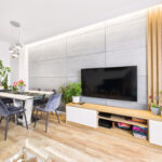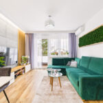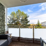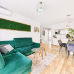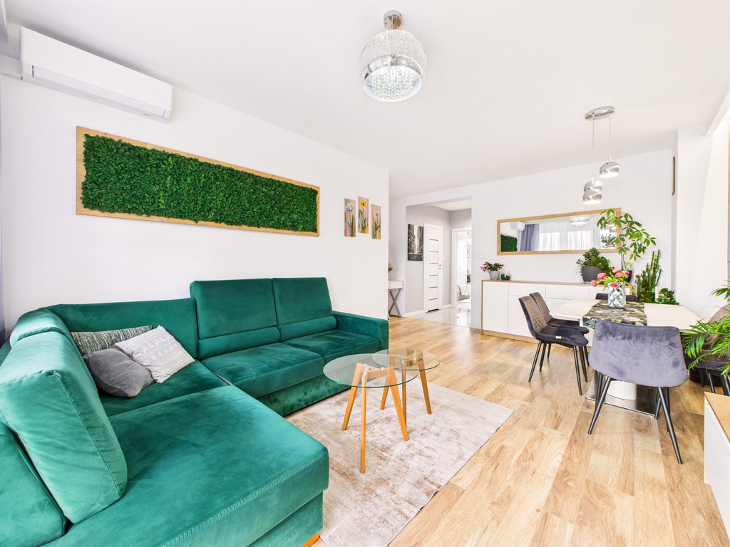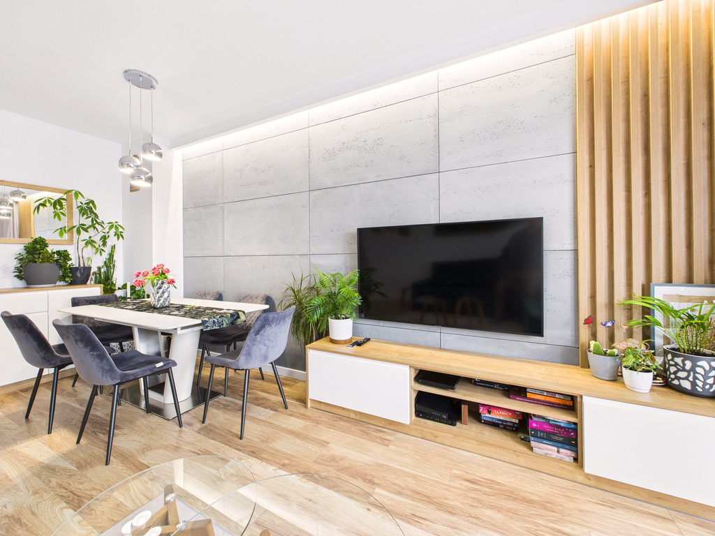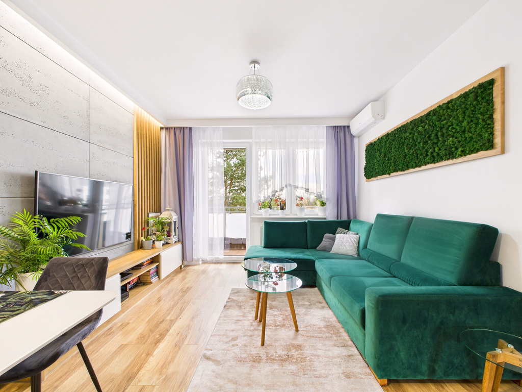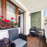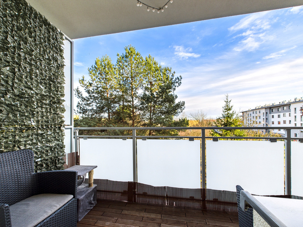 • Salon z klimatyzacją i wyjściem na spory balkon, na którym położona jest deska tarasowa – idealne miejsce na kawę albo odpoczynek po pracy