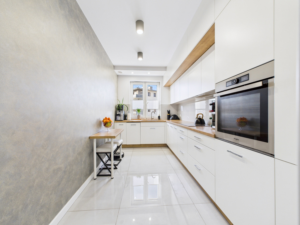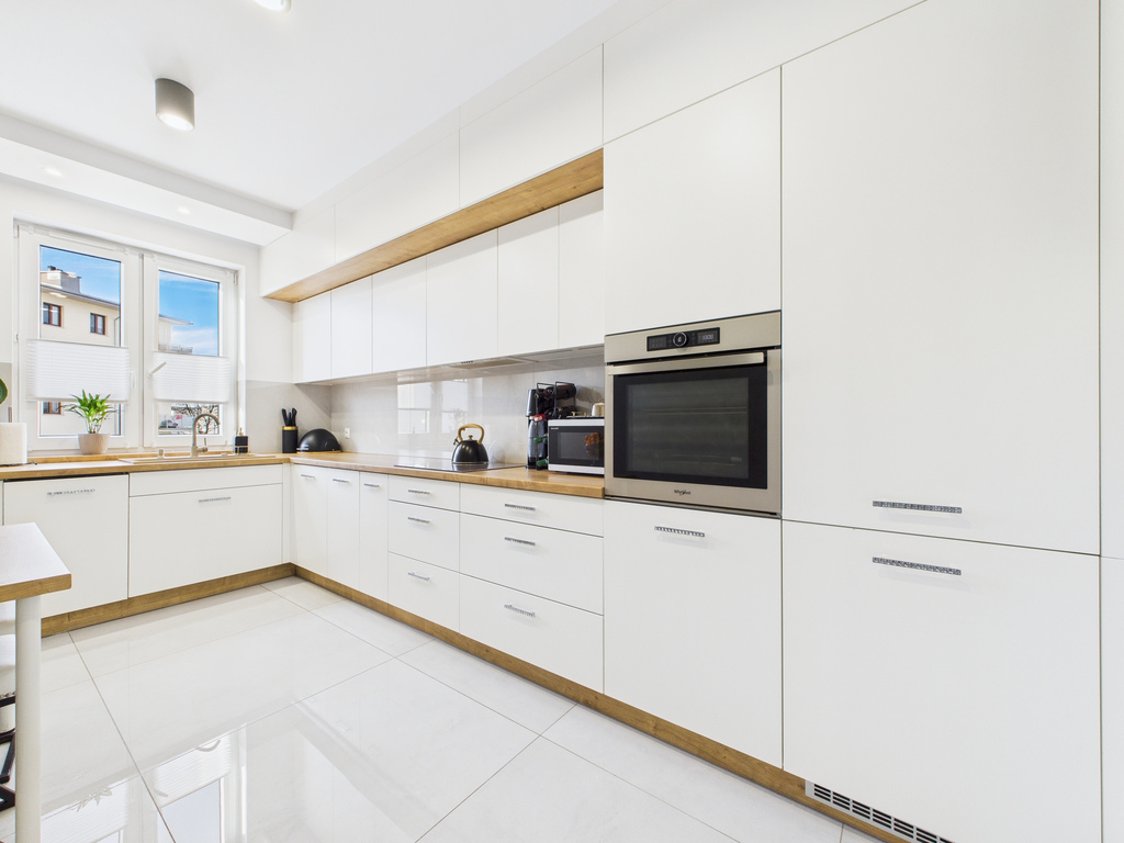 • Oddzielna, jasna kuchnia w pełnej zabudowie, z piekarnikiem, płytą, zmywarką i lodówką