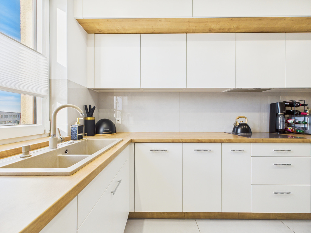 • Zabudowa kuchenna z kompletem sprzętu AGD: lodówka, piekarnik, zmywarka itd.
