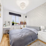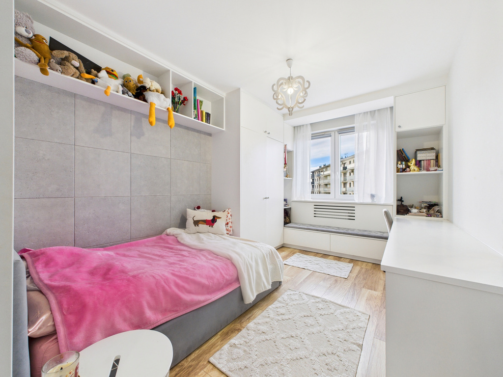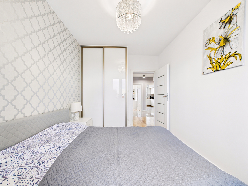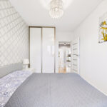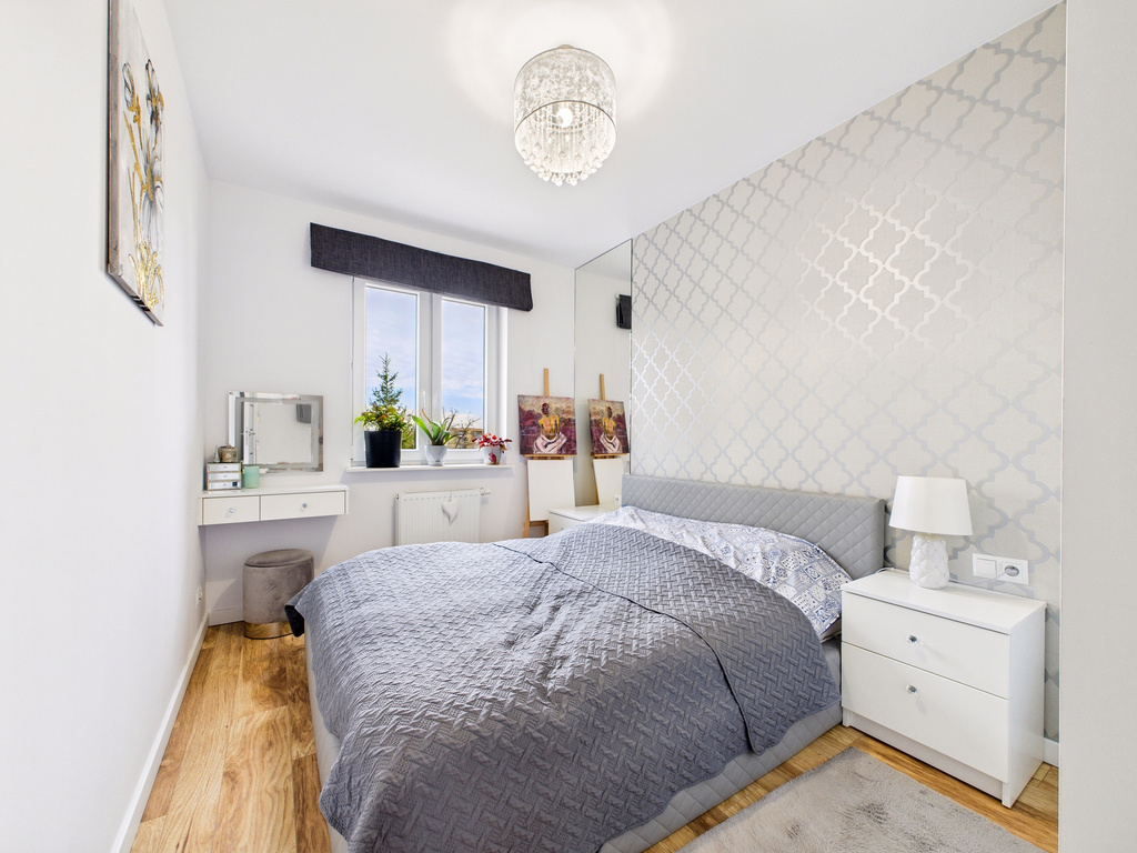• Dwie sypialnie – główna z dużym łóżkiem i zabudową, druga obecnie jako pokój dziecka (może pełnić funkcję gabinetu lub pokoju gościnnego)
