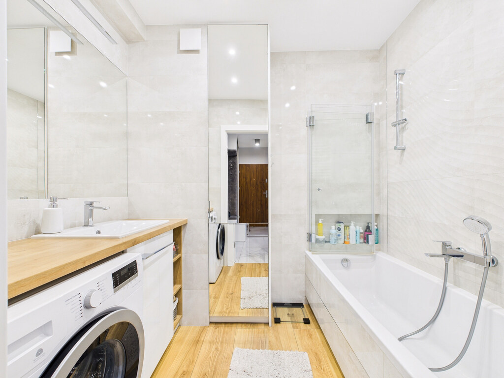 • Łazienka z wanną, parawanem prysznicowym i zabudowami