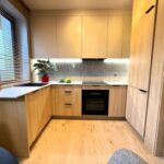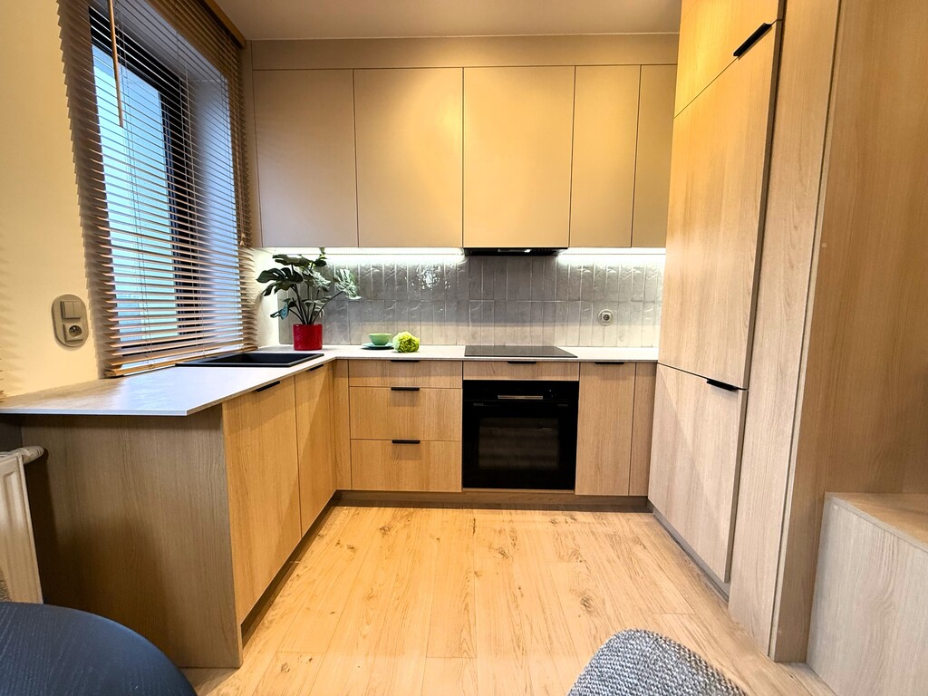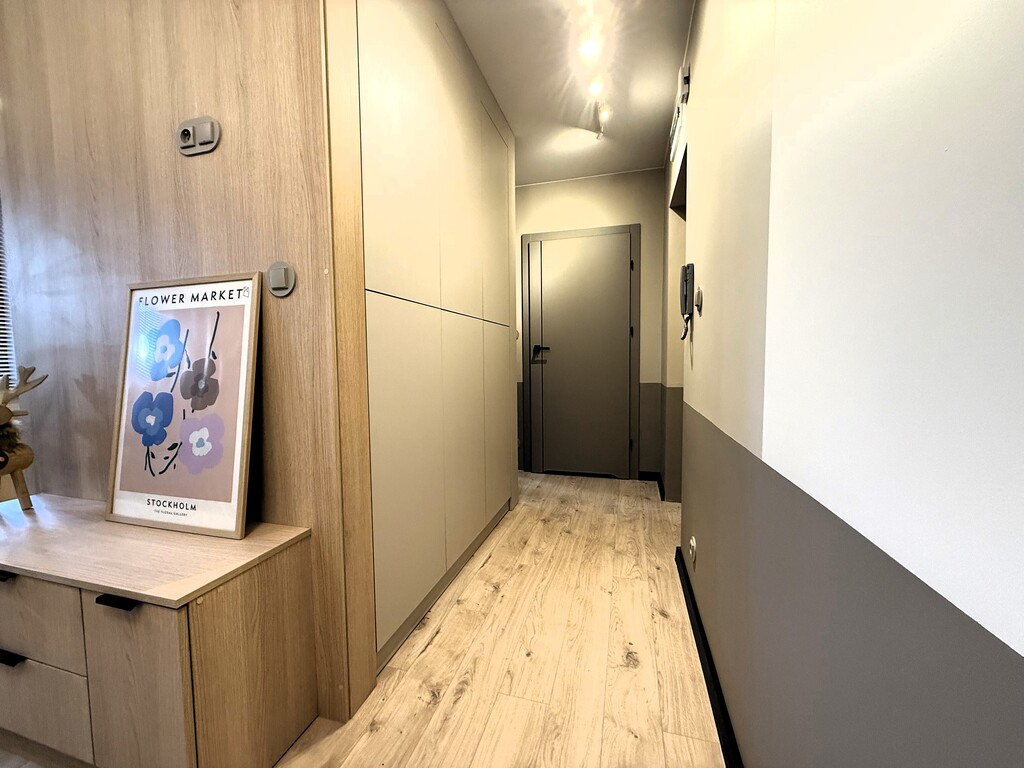 Mieszkanie jest w pełni wykończone — na podłogach znajdują się wysokiej jakości panele, ściany są gładkie i świeżo pomalowane, a łazienka urządzona została w nowoczesnym, estetycznym stylu. Zamontowano w niej kabinę prysznicową z brodzikiem. Lokal wyposażono również w kompletną zabudowę kuchenną wraz z piekarnikiem i płytą grzewczą, stół w części jadalnianej, wygodną kanapę w salonie, pojemną szafę w przedpokoju oraz łóżko w sypialni. Całość tworzy spójną, nowoczesną i gotową do zamieszkania przestrzeń.