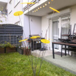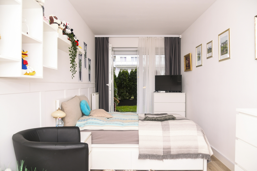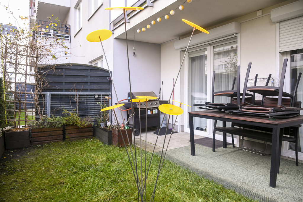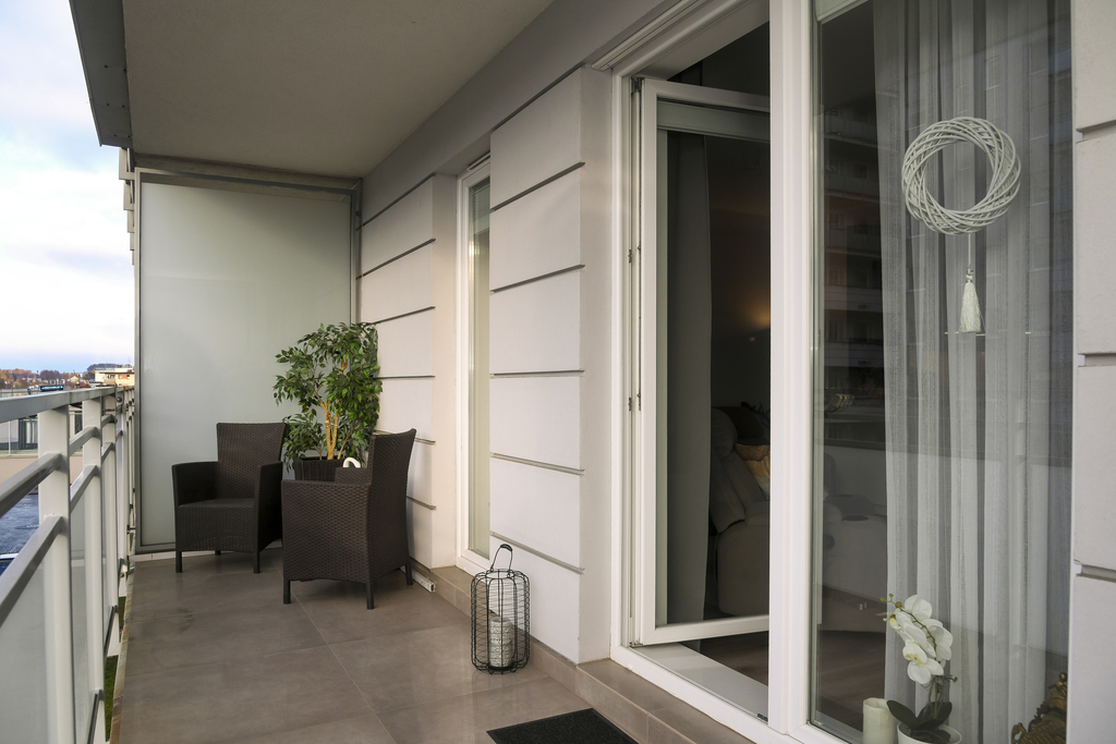 Bardzo wygodnie wypoczywa się na balkonie od salonu , przestronnym na tyle, aby ustawić na nim meble wypoczynkowe .Szeroka panorama miasta rozciągająca się za oknami daje poczucie dodatkowej przestrzeni Pomimo, że lokal położony jest na II piętrze, to od strony dwóch sypialni, posiada ogród , który zbudowany jest na przylegającej do budynku hali garażowej. Właściciele pozostawiają w nim meble oraz grill.