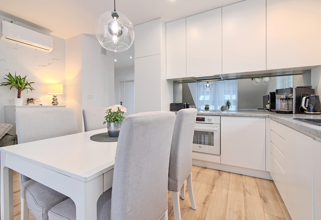 - w pełni wyposażona kuchnia (AGD: piekarnik Amica, płyta indukcyjna Samsung, zmywarka Amica, lodówka Samsung, okap Teka)