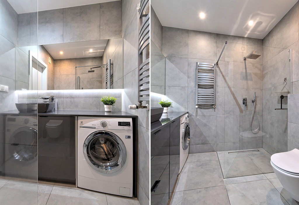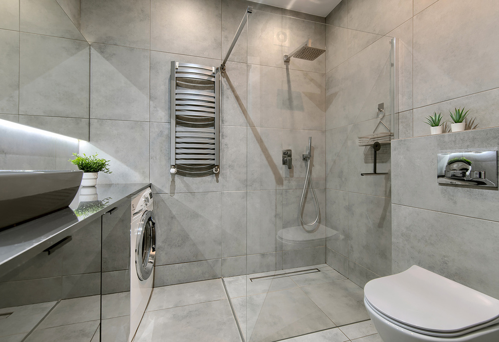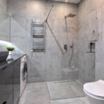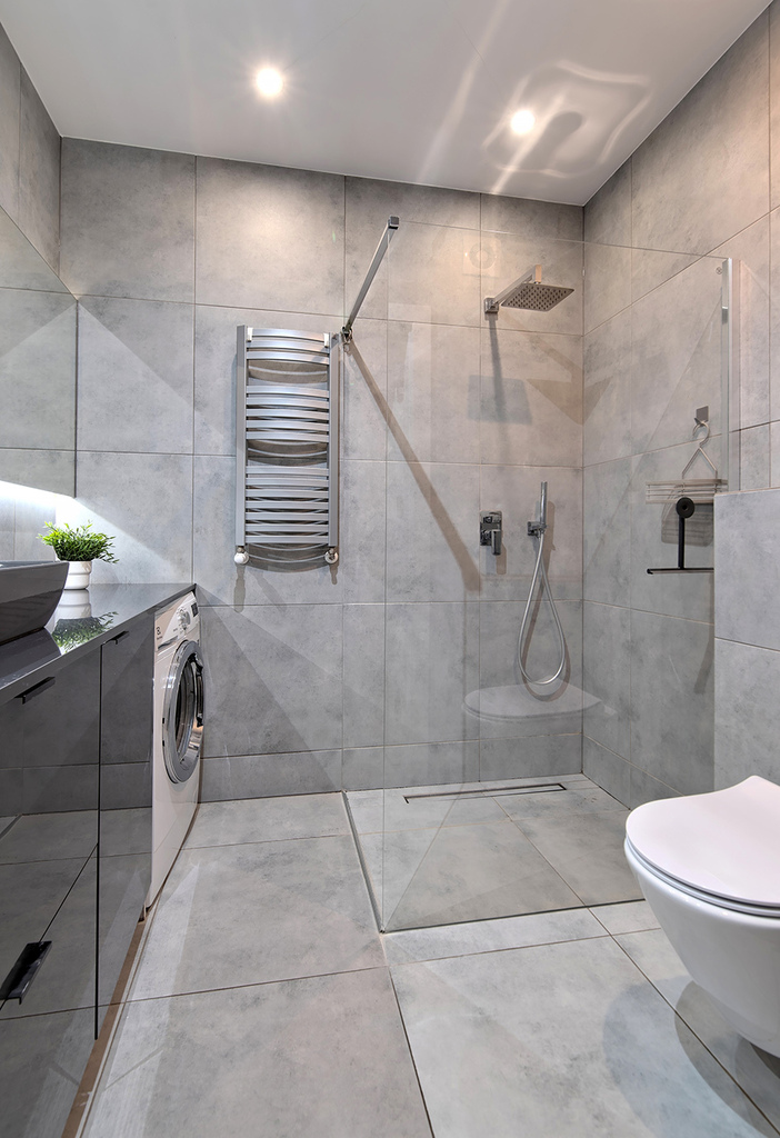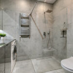 - łazienka wyposażona w ogrzewanie podłogowe sterowane elektronicznie, prysznic oraz baterie podtynkowe