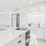 Kuchnia zabudowana jest nowoczesnymi szafkami i wyposażona w lodówkę z zamrażarką, pralkę, zmywarkę oraz wyspę z płytą indukcyjną i piekarnikiem.