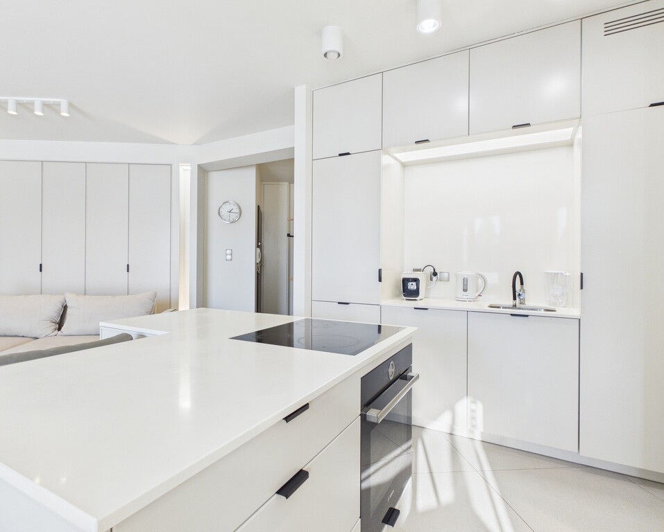 Kuchnia zabudowana jest nowoczesnymi szafkami i wyposażona w lodówkę z zamrażarką, pralkę, zmywarkę oraz wyspę z płytą indukcyjną i piekarnikiem.