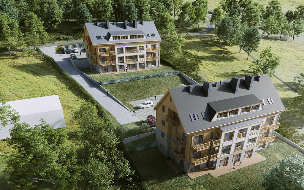 Dwa nieduże i kameralne budynki zaprojektowane kaskadowo przez doświadczoną pracownię posiadają eleganckie elewacje, zgodne z regionalnym charakterem miejscowości. Powierzchnie i układy pomieszczeń zostały dopasowane do wymagań klientów. Z miejsca inwestycji rozciąga się malowniczy widok na Sępią Górę i Izery.