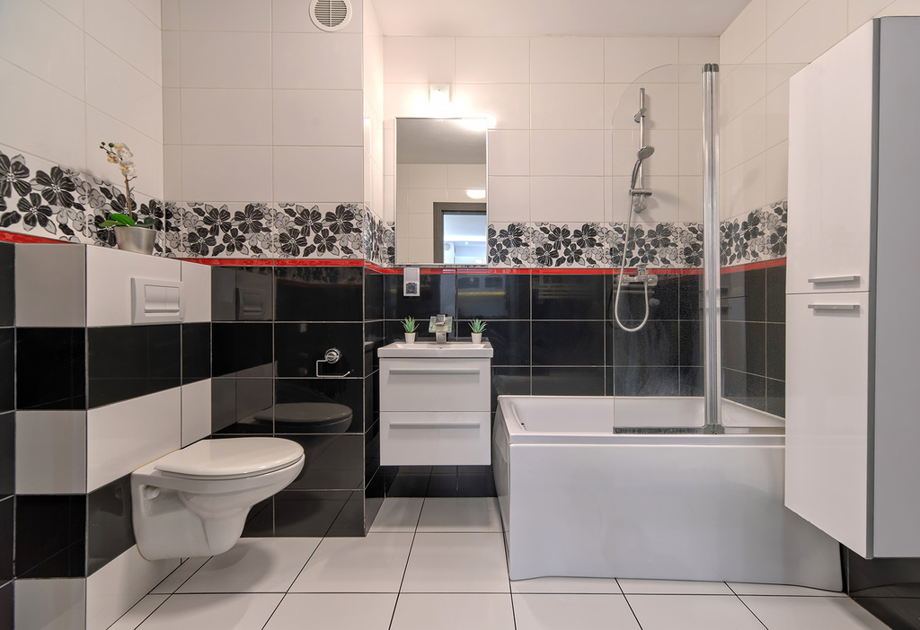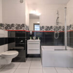 - łazienka wyposażona w wannę z prysznicem