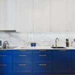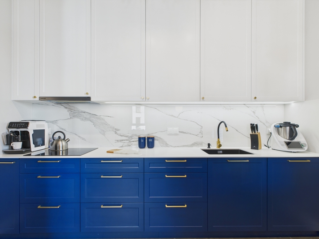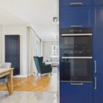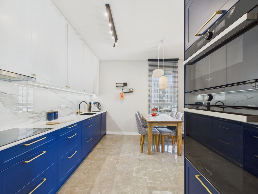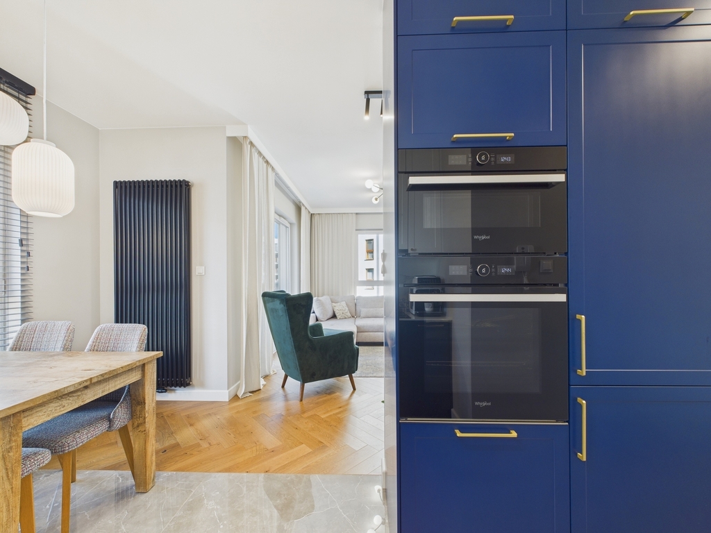 • Salon z aneksem kuchennym i wiatrołapem (40 m²): Jasna, przestronna strefa z wysokiej klasy zabudową kuchenną wykonaną na zamówienie przez stolarza. Mechanizmy Blum, blat z efektem marmuru, nowoczesne AGD oraz eleganckie, granatowe fronty podkreślają charakter wnętrza. Wydzielona strefa jadalna z drewnianym stołem to idealne miejsce na rodzinne posiłki.