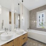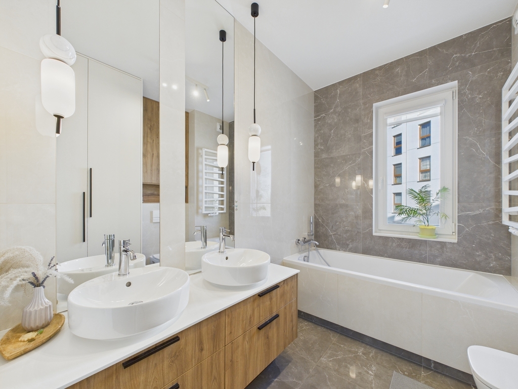 • Łazienka (5,2 m²): Luksusowo wykończona, wyposażona w wannę, dwie umywalki  oraz zabudowę meblową wykonaną na wymiar.
