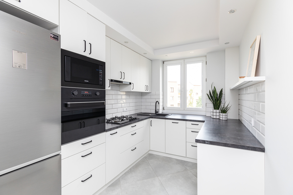 - kuchnia oddzielna z oknem, ze sprzętami Samsung w zabudowie (zmywarka, piekarnik, płyta gazowa, piekarnik, lodówka, zmywarka)