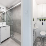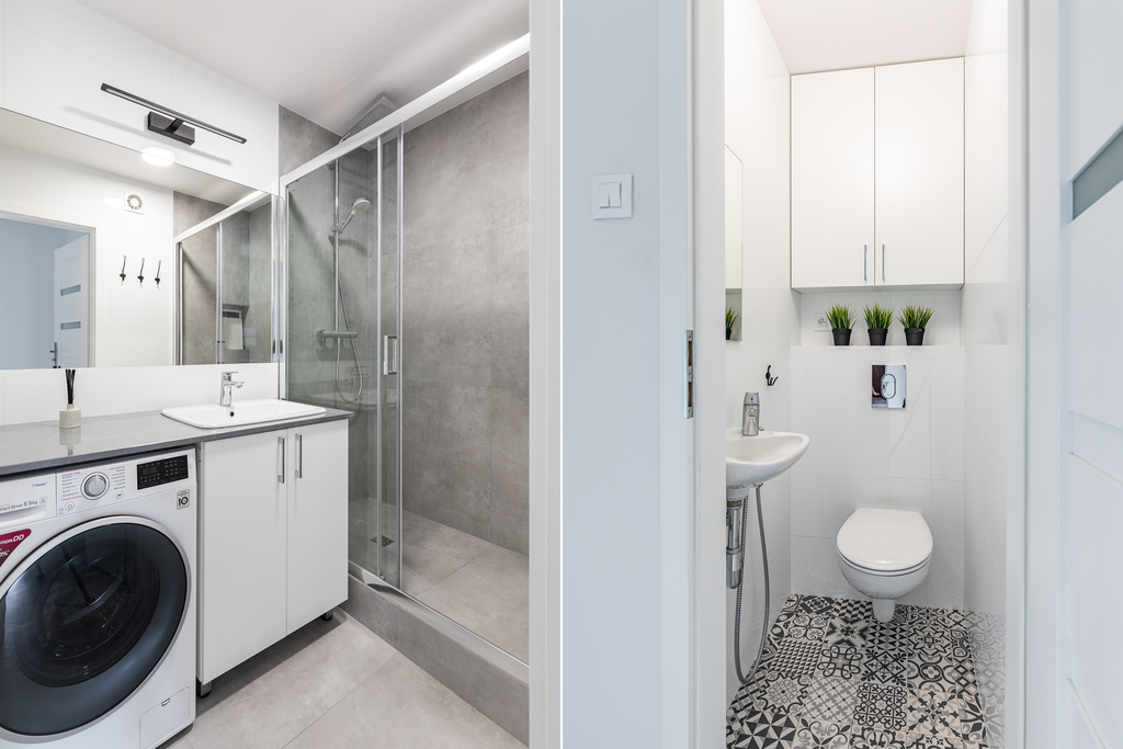 - w łazience prysznic duży prysznic i pralkosuszarka z funkcją pary LG