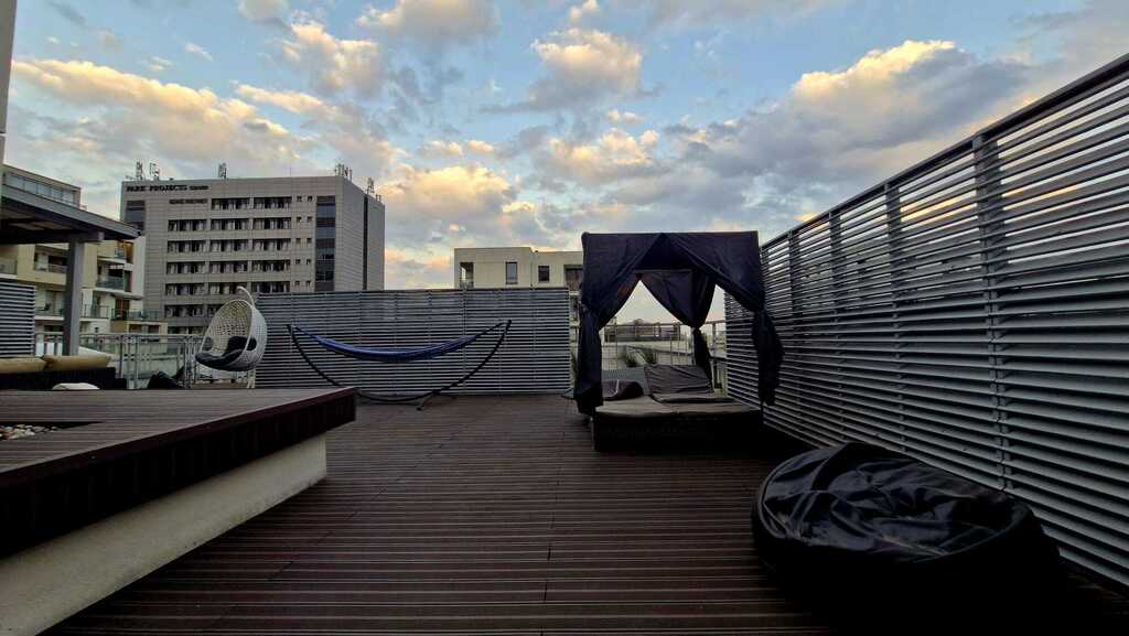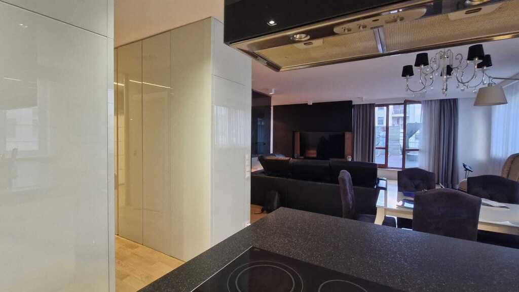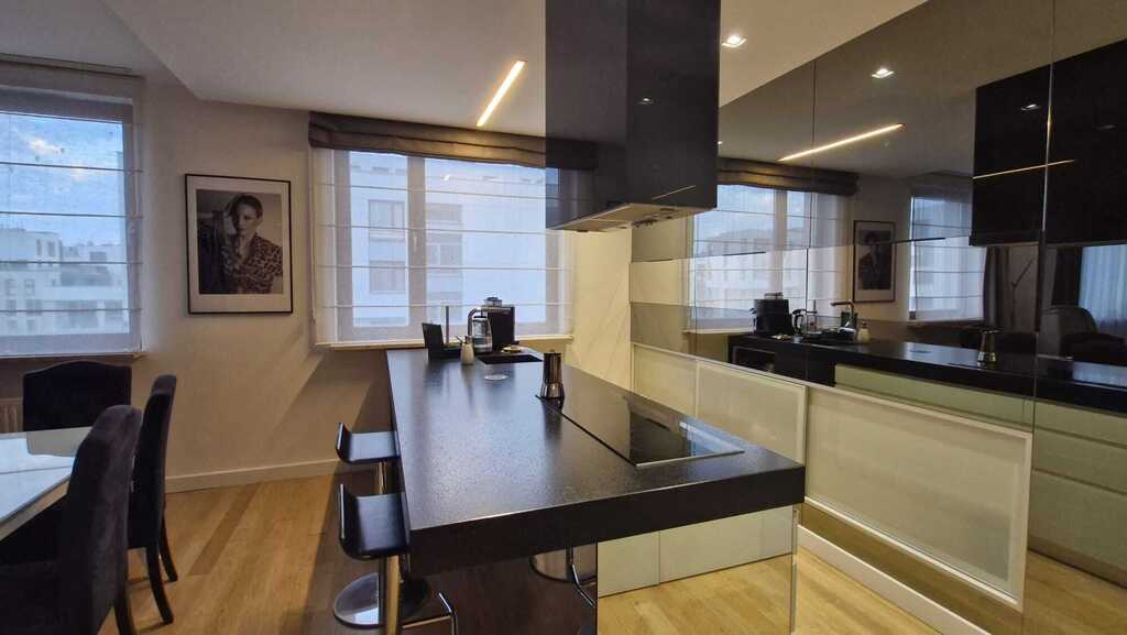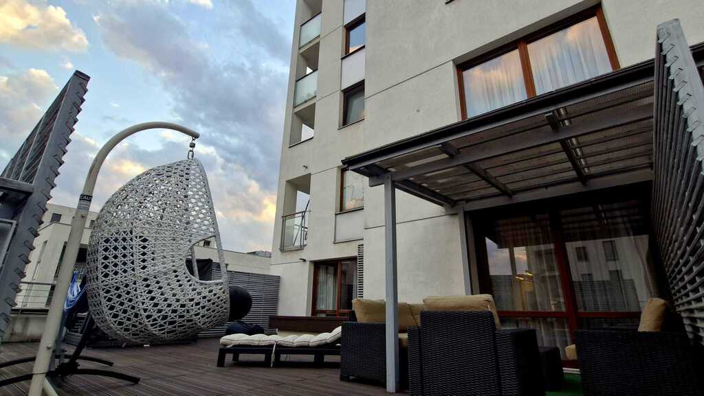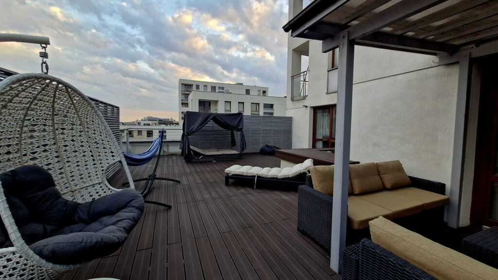 Dodatkowym, bezsprzecznym atutem jest 70-metrowy taras z imponującym widokiem na panoramę Warszawy – idealne miejsce na odpoczynek, spotkania towarzyskie czy przyjęcia.