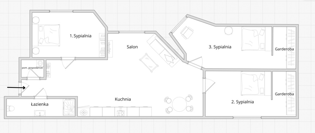 - 59,72 mkw, cztery pokoje : salon z kuchnią, trzy sypialnie