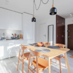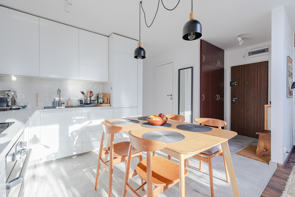 -  W pełni wyposażonej kuchni otwartej na salon (zmywarka, pralka, piekarnik oraz wszelkie przybory kuchenne)