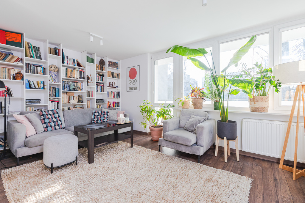 The building is set back in the second row from Międzynarodowa Street, making it a quiet place to live. The apartment is fully furnished and ready for move-in (tenants can agree on whether to keep or remove the books and decorative elements from the living room shelves).