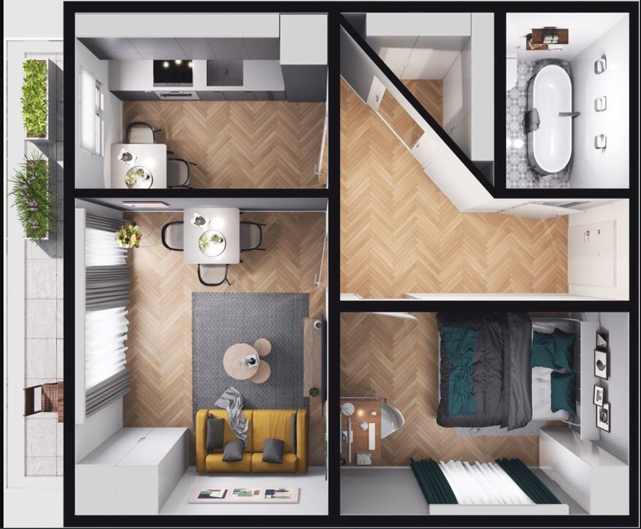 Przedstawione wizualizacje i grafiki mają charakter wyłącznie poglądowy i stanowią wyłącznie materiał pomocniczy, ułatwiający zorientowanie się w ogólnym wyglądzie oferowanej nieruchomości.