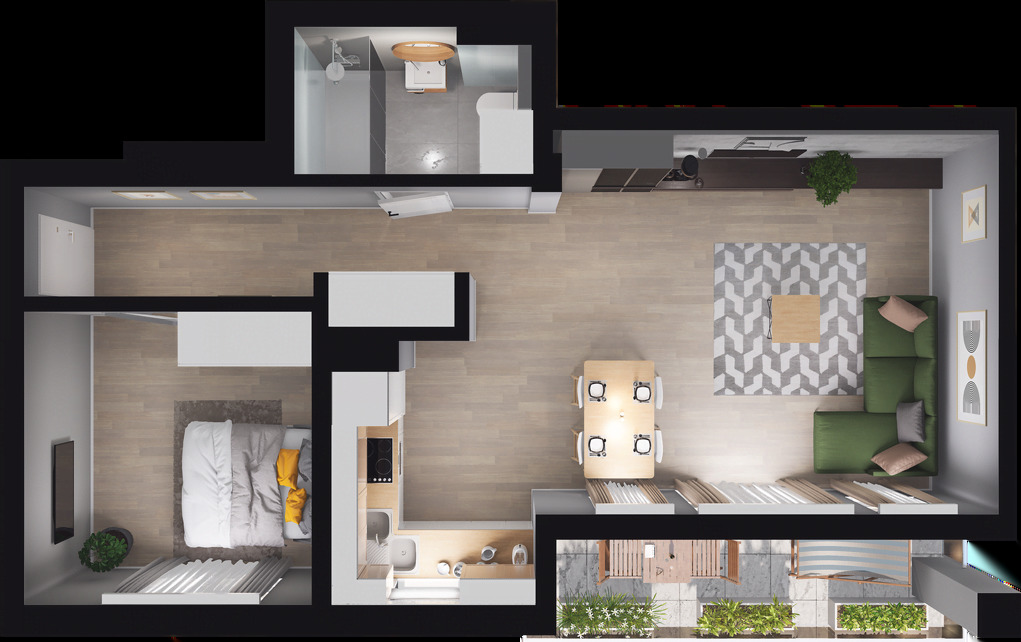 Przedstawione wizualizacje i grafiki mają charakter wyłącznie poglądowy i stanowią wyłącznie materiał pomocniczy, ułatwiający zorientowanie się w ogólnym wyglądzie oferowanej nieruchomości.