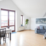 Okna salonu wychodzą na pd-zach (widok na skyline centrum Warszawy), kuchni na pn-wsch (widok na patio)