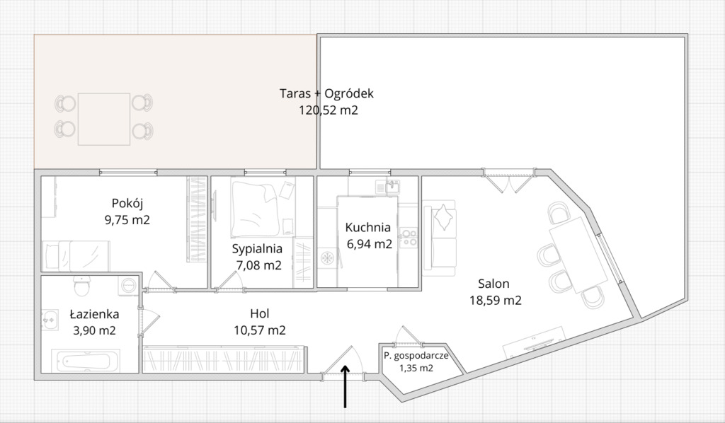 • przestronny salon z wyjściem na ogródek – 18,59 m²