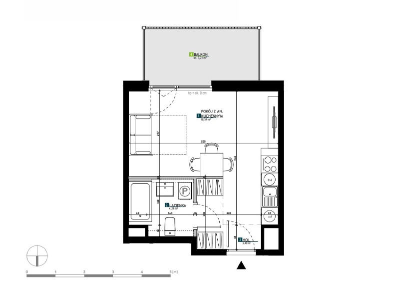 - Pokój z aneksem kuchennym - 18,59 m2