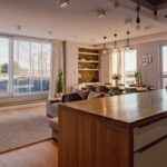 UKŁAD POMIESZCZEŃ- Przestronny salon z aneksem kuchennym (ok 52m²) – duże, narożne przeszklenia zapewniają panoramiczny widok i wpuszczają mnóstwo naturalnego światła, optycznie powiększając przestrzeń. Dodatkowym przedłużeniem strefy dziennej jest wyjście na przestronny taras.