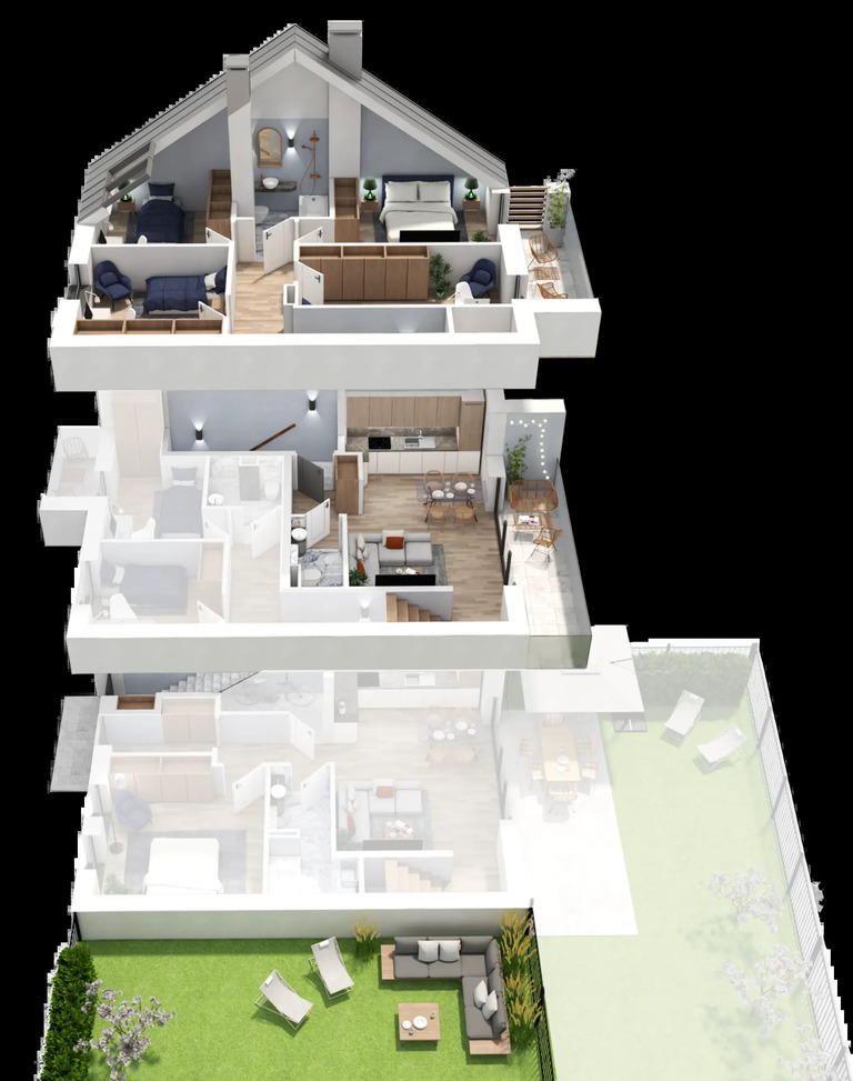 - Dwupoziomowy rozkład zapewniający komfortowe oddzielenie strefy dziennej i nocnej,