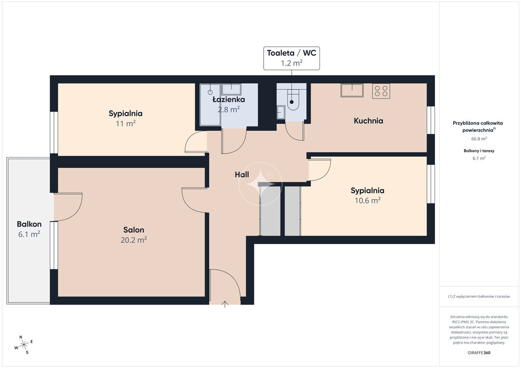- salon (ok. 20,2 m²) z wyjściem na duży balkon – 6,1 m²