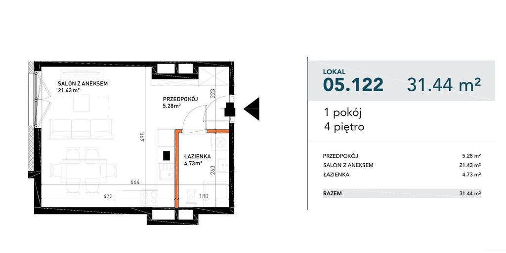 - pokój dzienny z aneksem kuchennym (21,43 m2)