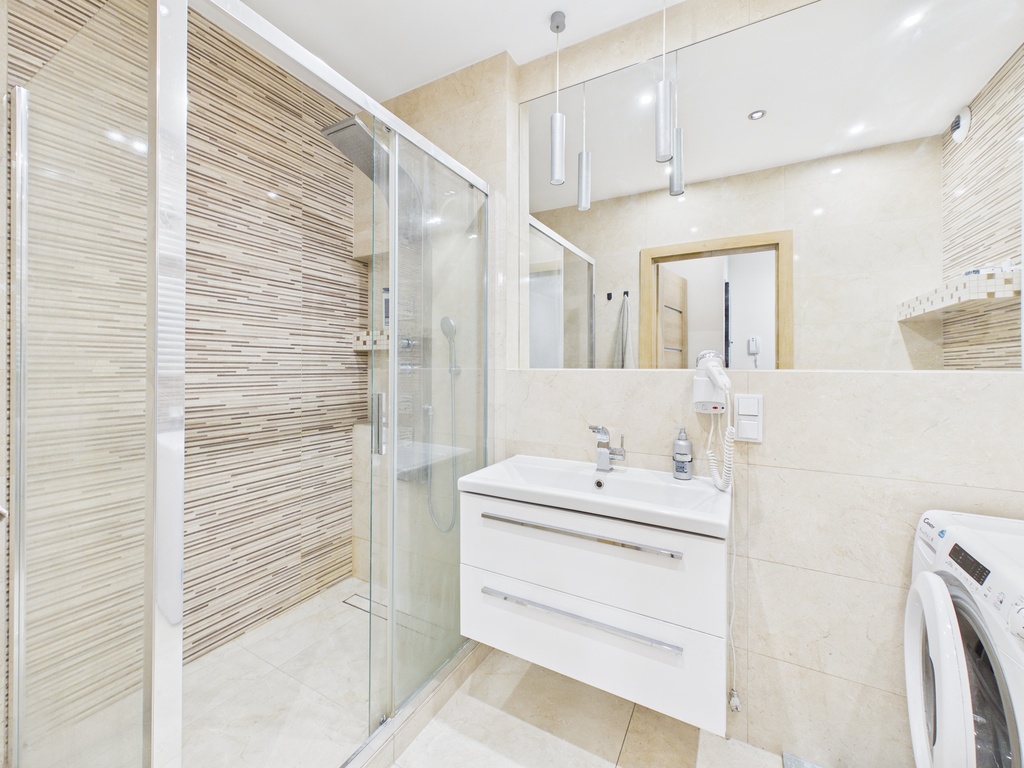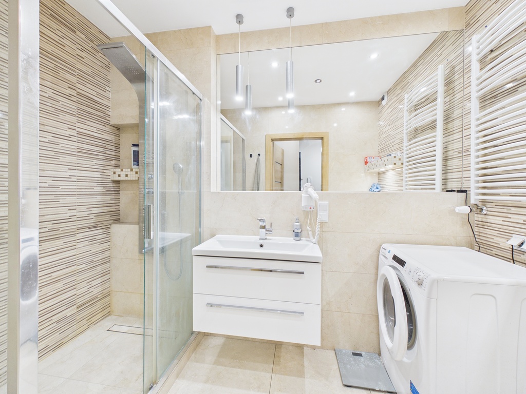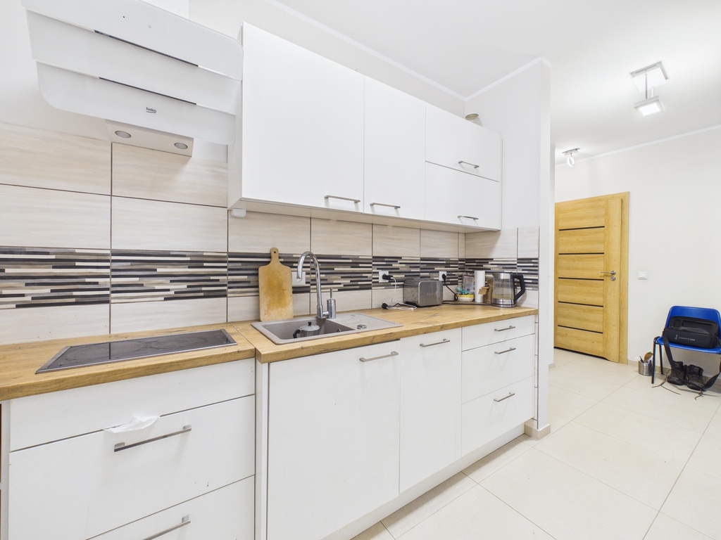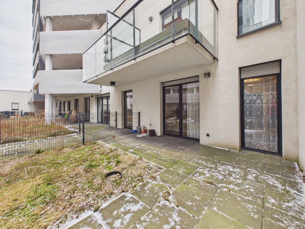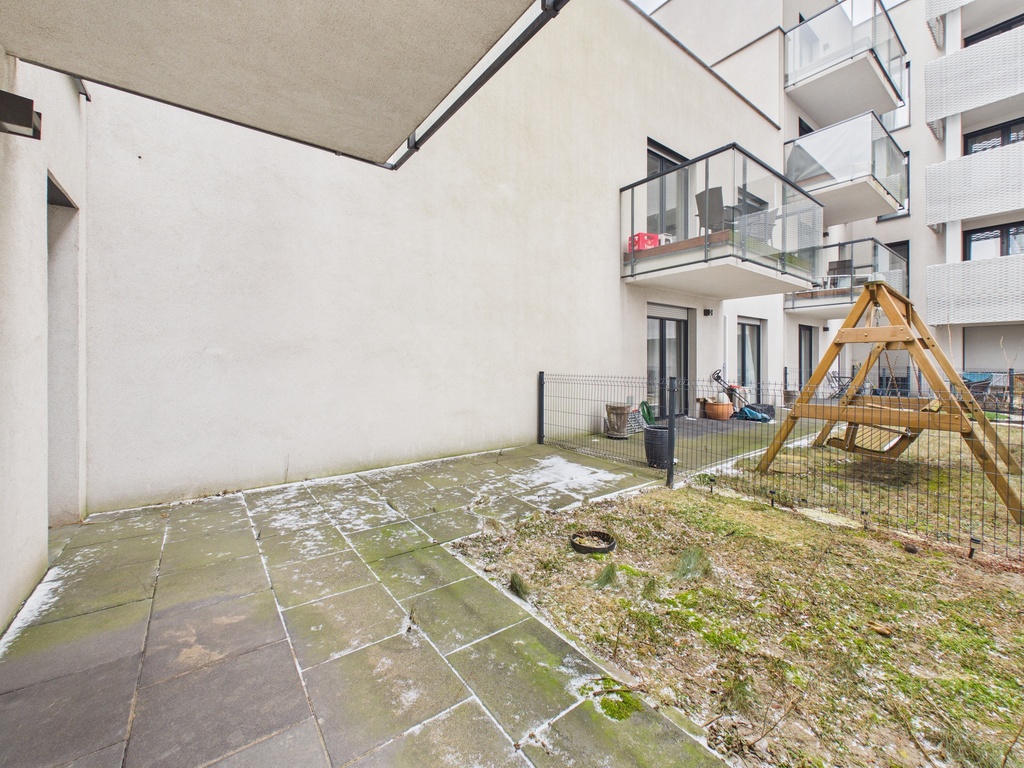 Do mieszkania przynależy jest spory taras i własny ogródek. Kuchnia jest oddzielona ścianką od pokoju dziennego i znajduje się w niej zabudowa meblowa wraz z kompletem sprzętu AGD. W łązience jest duży prysznic, szafka z umywalką, WC oraz pralka.
