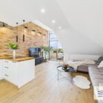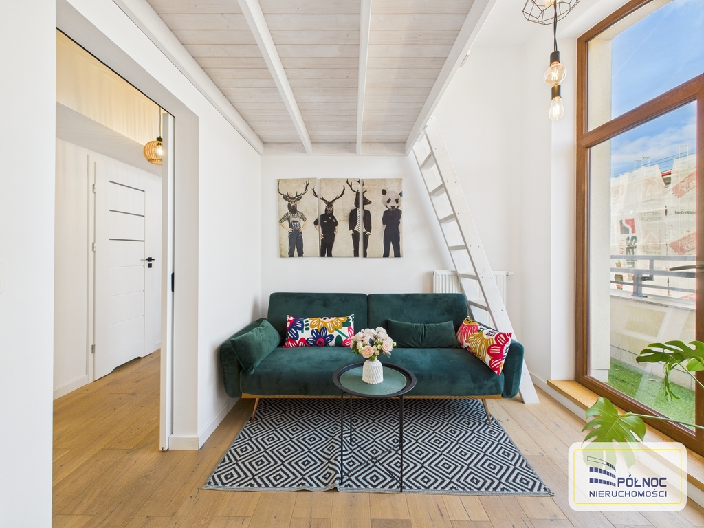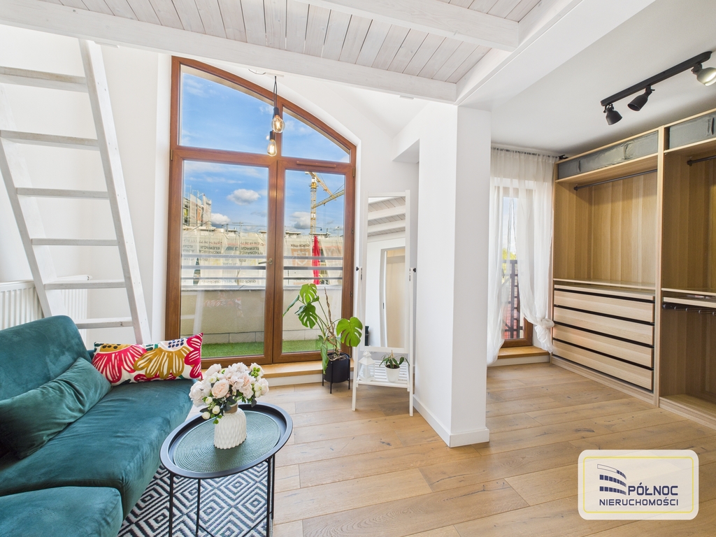 Wysokość pomieszczeń i oryginalna antresola nadają mieszkaniu wyjątkowy charakter, a przemyślane rozwiązania zapewniają komfort i wygodę na co dzień.