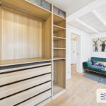- Duża sypialnia z funkcjonalnym podziałem na część dzienną i nocną. Wysoki sufit umożliwił stworzenie antresoli z łóżkiem, a pod nią znajduje się miejsce do pracy lub wypoczynku. W sypialni znajduje się również zabudowa meblowa na dwóch ścianach o łącznej szerokości 4 m, wykonana na wymiar i sięgająca sufitu.