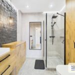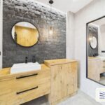 - Łazienka z pełną zabudową meblową do sufitu oraz zabudowaną pralką