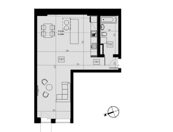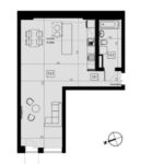 - salonu z aneksem kuchennym i wyjściem na balkon (45,81 m2)