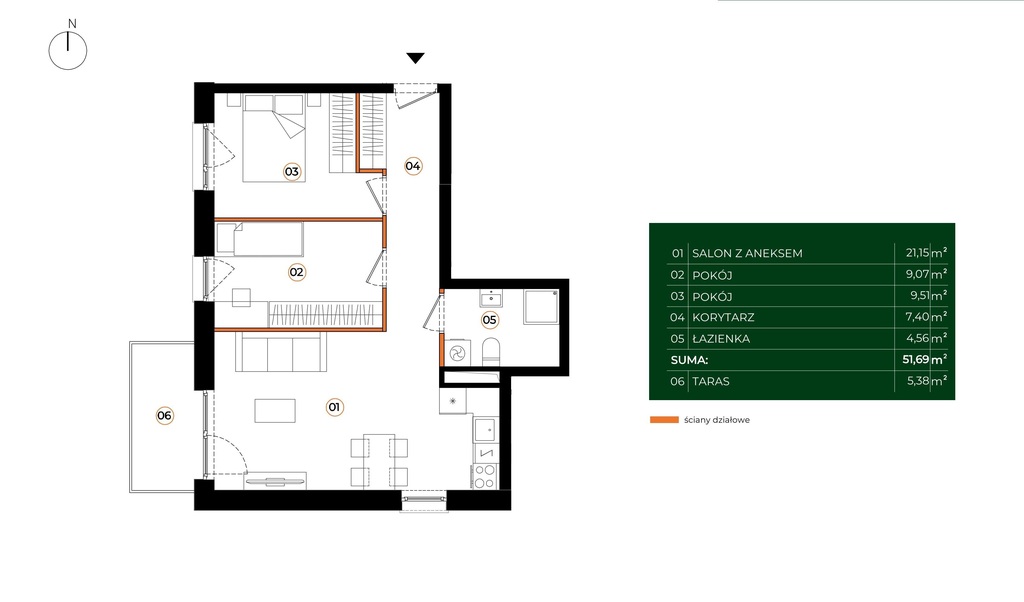 - salon z aneksem kuchennym i wyjściem na taras 1 (21,15 m2)