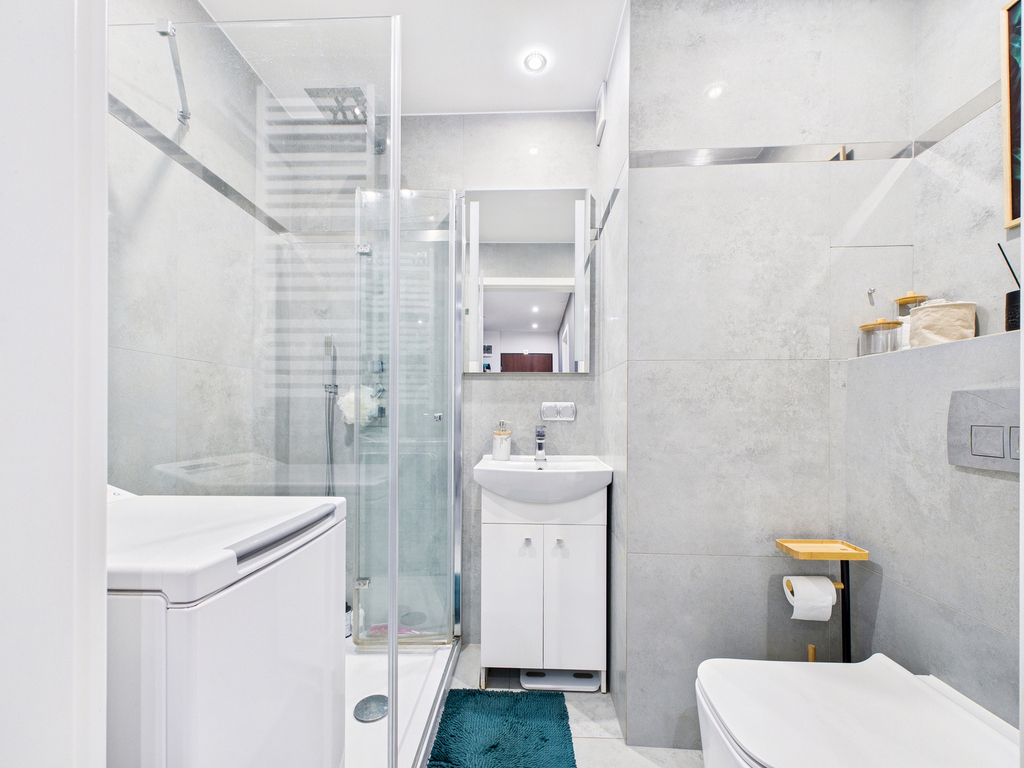 • Łazienka z prysznicem, umywalką, szafką pod umywalką i pralką