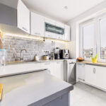 • Kuchnia w zabudowie, jasne fronty, wygodny blat roboczy, oświetlenie podszafkowe LED