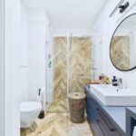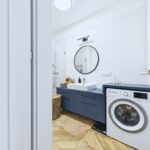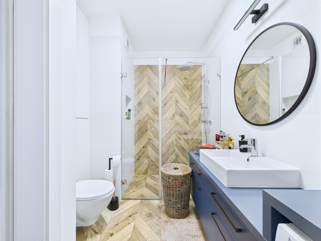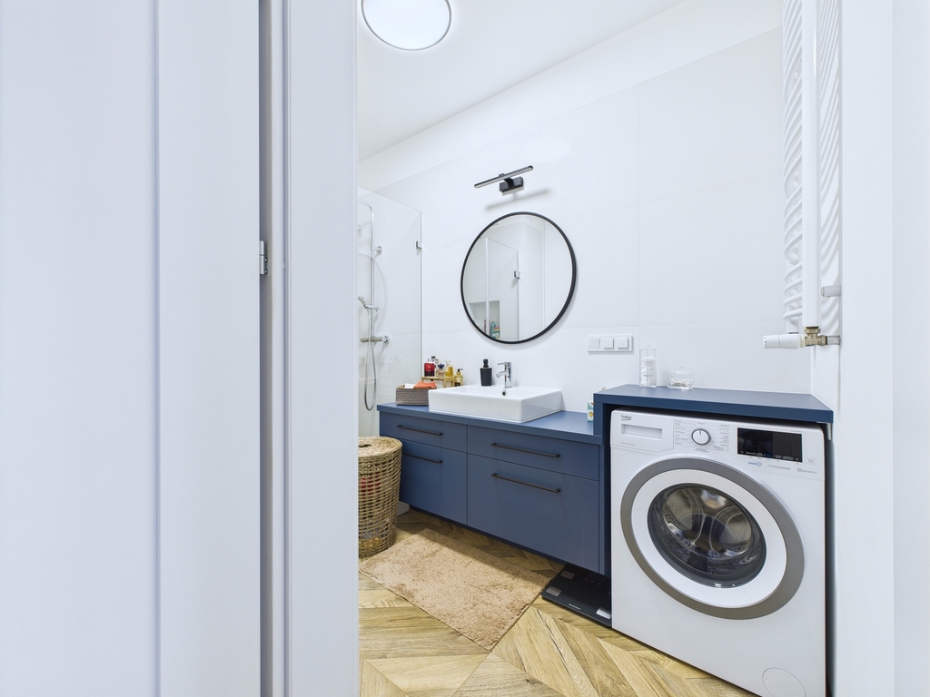 • Nowoczesna łazienka z prysznicem, pralką i praktyczną zabudową nad WC