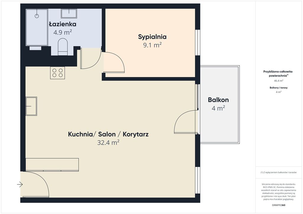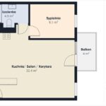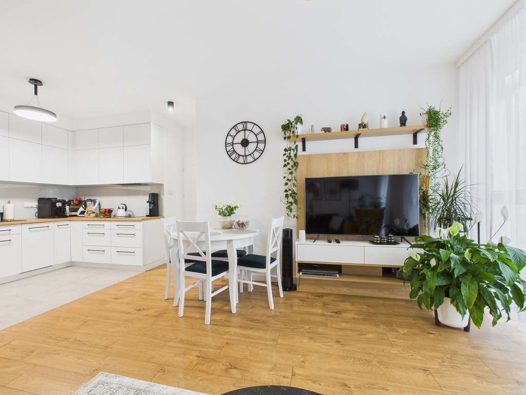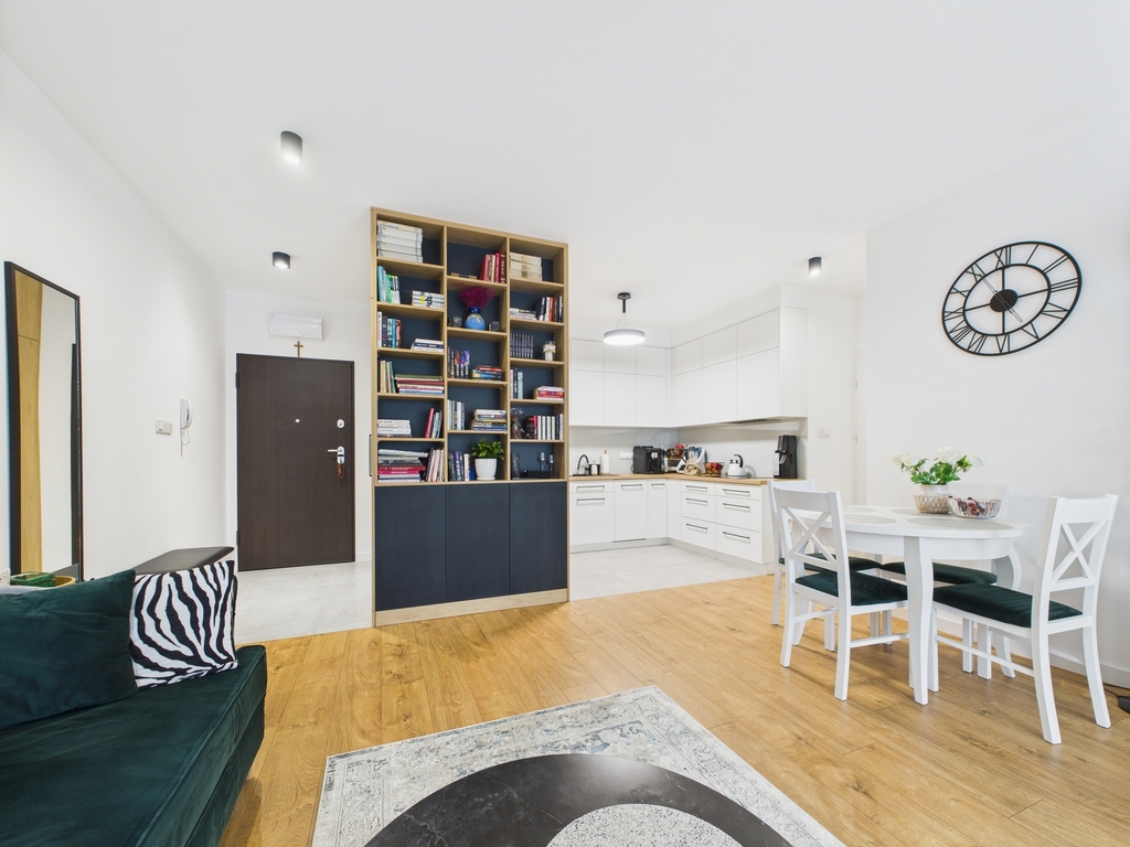 • Salon z aneksem kuchennym i wyjściem na balkon