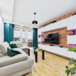 Salon z wyjściem na balkon – ustawny, z miejscem na dużą sofę i strefę TV
