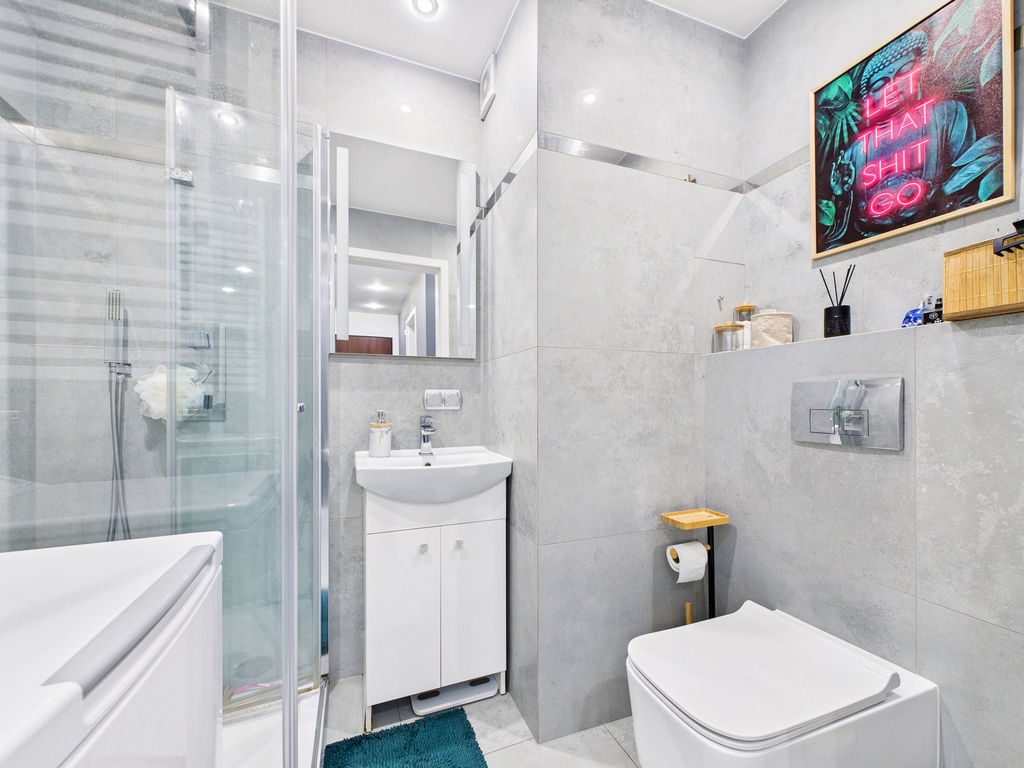 • Łazienka z prysznicem, umywalką, szafką pod umywalką i pralką