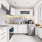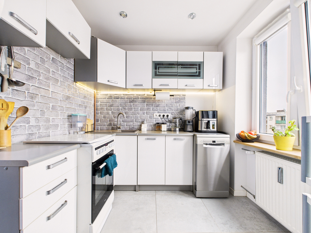 • Kuchnia w zabudowie, jasne fronty, wygodny blat roboczy, oświetlenie podszafkowe LED