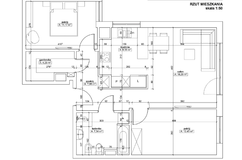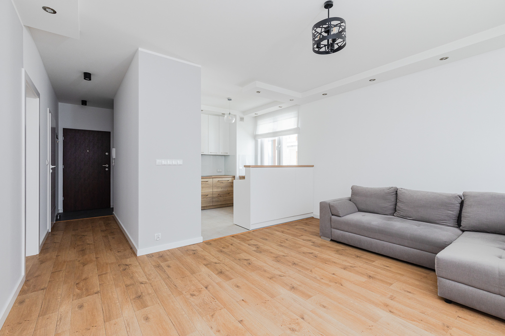 - Przestronnego salonu z eleganckim aneksem kuchennym w pełnej zabudowie - 27 m²