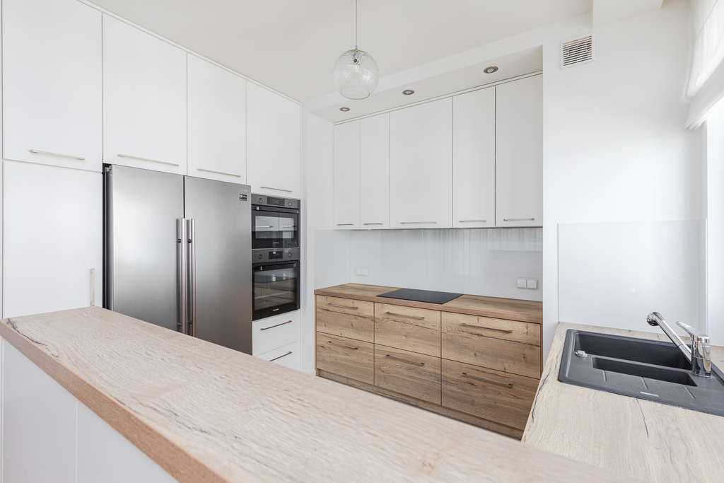 Kuchnia wyposażona jest we wszystkie niezbędne urządzenia AGD marki BOSH i Samsung, w tym zmywarkę, dużą lodówkę, piekarnik, kuchenkę mikrofalową oraz płytę indukcyjną.